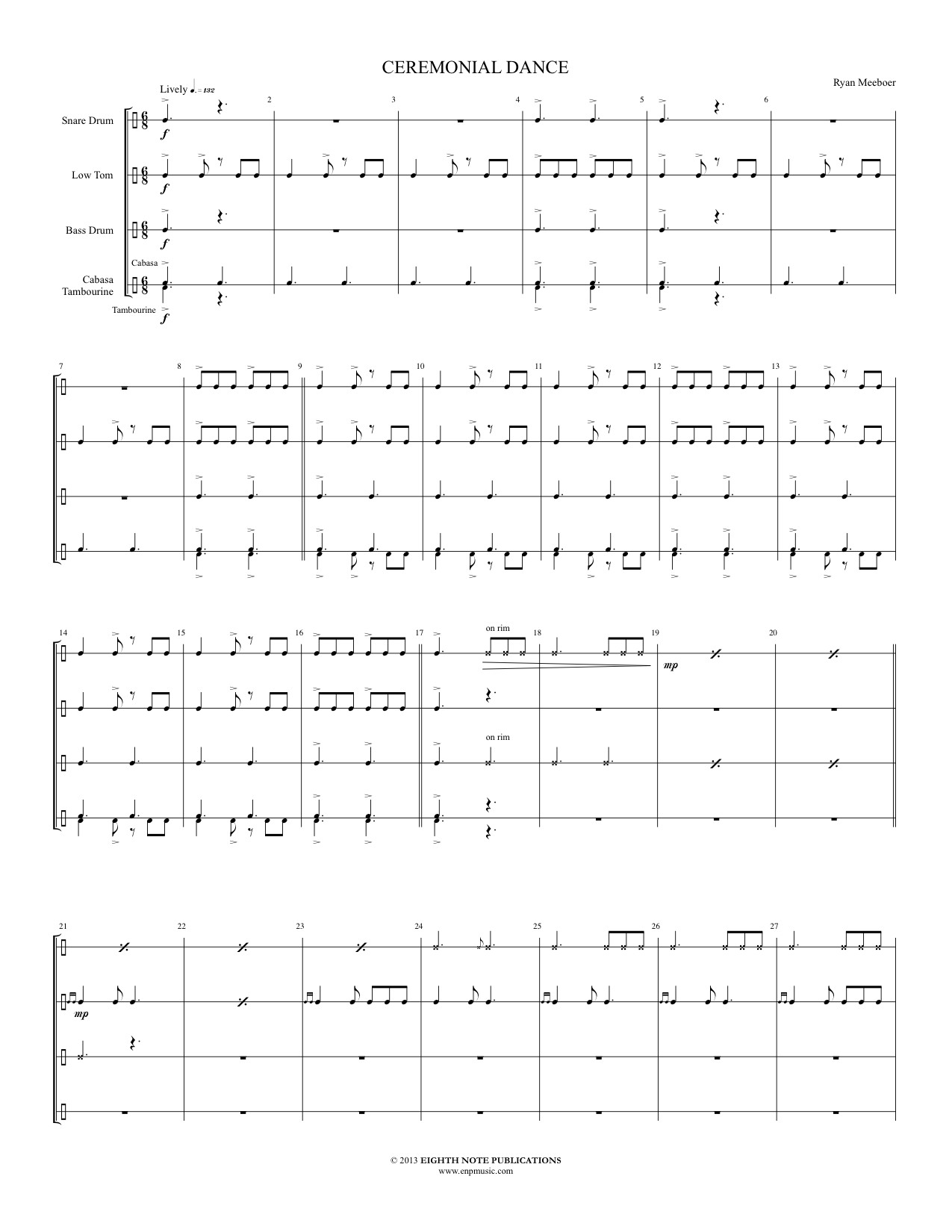 This percussion ensemble (requiring 5 players) is an upbeat piece with the feeling reflecting a dance groove from medieval music. Although written in 6/8 time, parts of the composition use a polyrhythmic feel, crossing 6/8 with 3/4.