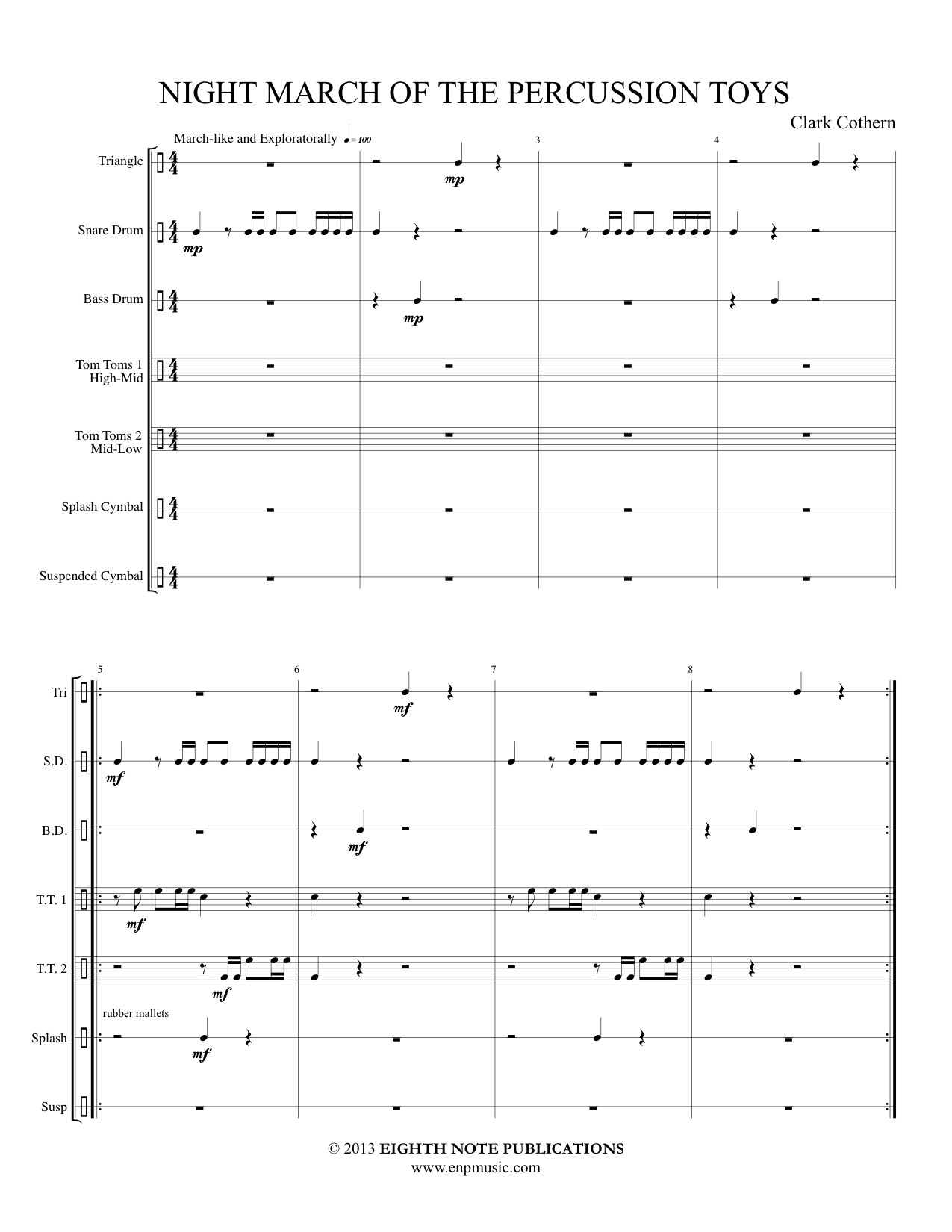 What do percussion toys do after Midnight when everyone s asleep? Listen to this piece and your imagination will tell you. There are 7 parts with no specialty or pitched instruments required.