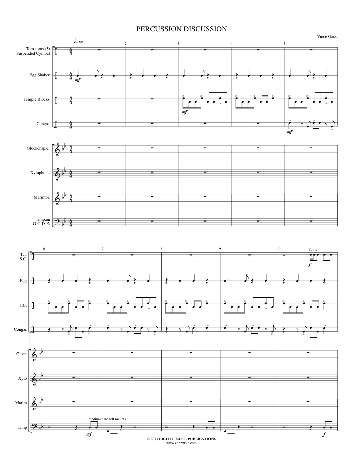 When it comes to percussion ensembles, talk is not cheap,... it s essential! Featuring an impressive array of things to hit, this "way cool" piece for things pitched and un-pitched will give percussionists and non-percussionists alike much to talk about. Grooves, moves, and mallet Blues; it s all good. So gather your posse now and just tell them to beat it! 8 players are required to perform this work. |