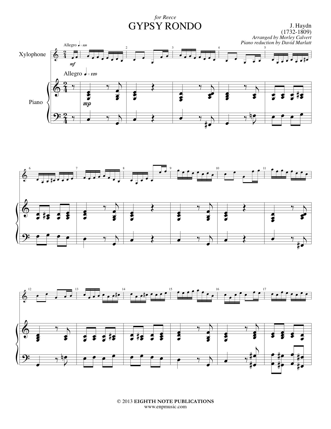 Haydn is best known for his symphonies but his chamber music is also excellent. On one of his two year long trips to London, Haydn wrote several piano trios. The best known of these is the G major Trio with its so-called Gypsy Rondo. This proves to be good fun when played on xylophone! |