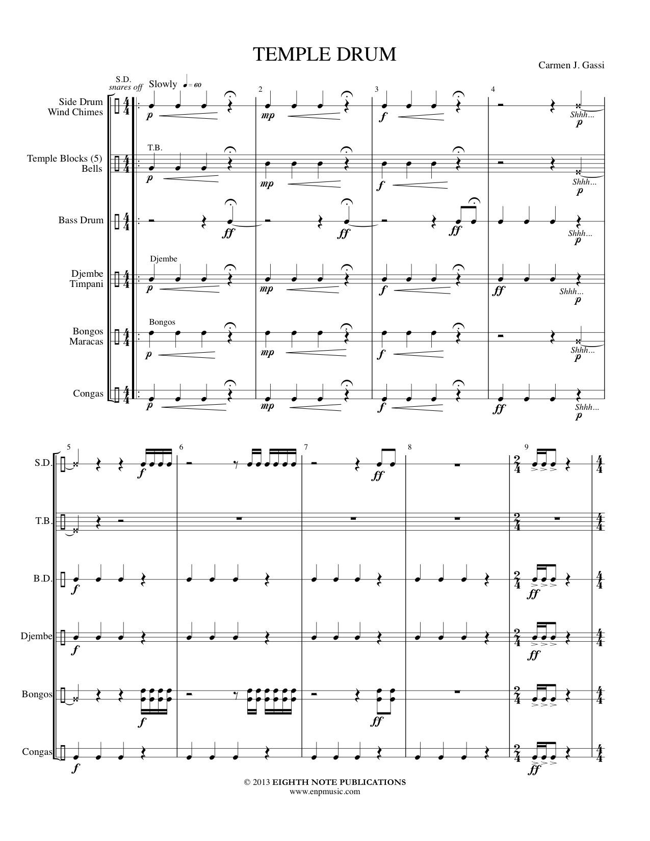 Exotic sounds and exciting rhythms highlight this percussive journey from beginning to end. Your percussion ensemble will enjoy the adventure and improve their playing as they work together to conquer Temple Drum. It is scored for a variety of pitched and non pitched instruments playable by a minimum of 5 players. |