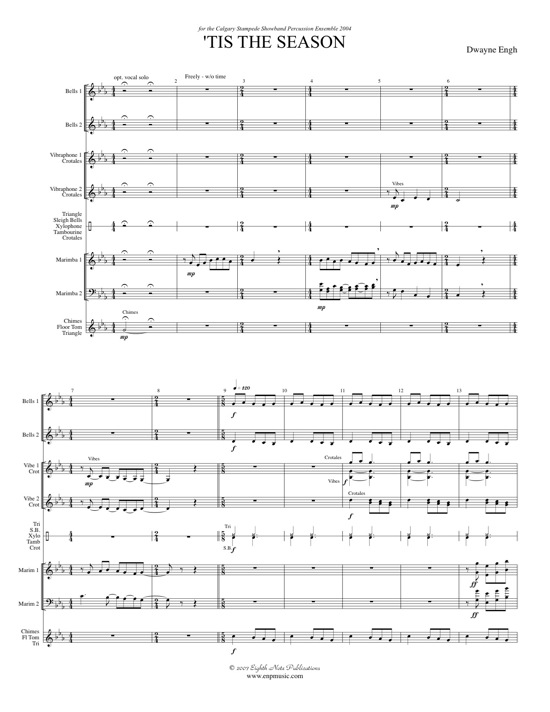 This clever composition would add something new and exciting to your Christmas concert or event. This piece is scored for a variety of mallet players and some toys and would involve at least 8 players. Several moods and feels are established and many well known melodies are used throughout this work. |