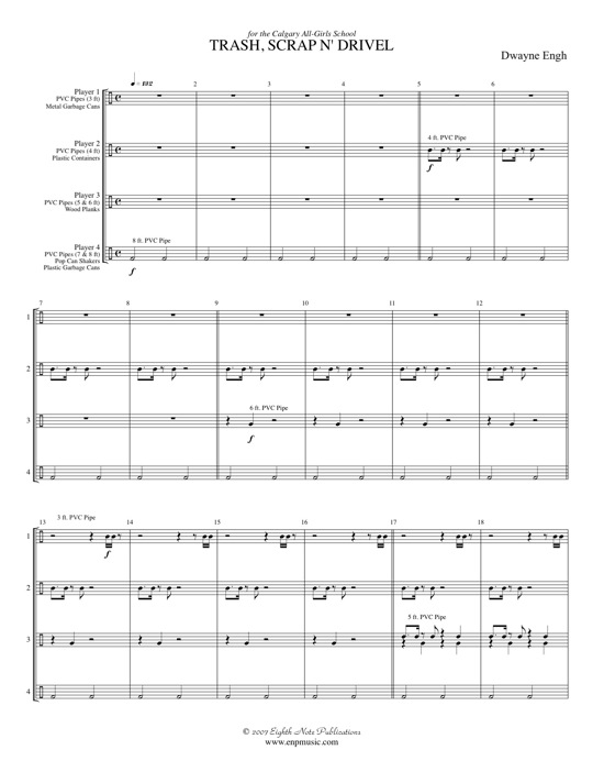 Trash, Scrap N Drivel was written with the intent of creating a fun piece for students to play that a non-musician could easily teach to an eighth grade class with little musical experience and that allowed many dramatic possibilities in the blocking and staging of the piece. It is scored for an ensemble of at least 8 players. |