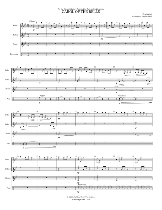 The simple setting of this well known tune was done in my first year of working with the percussion ensemble at a Junior High School. I had quite a few problems finding music suitable for their level of development, so I wrote a simple arrangement for them for the Holiday Season. We were lucky enough to have an Elementary School as a feeder school that had hand bells, so the optional hand bell introduction was written. It is arranged for 2 Bells parts, Chimes and percussion. |