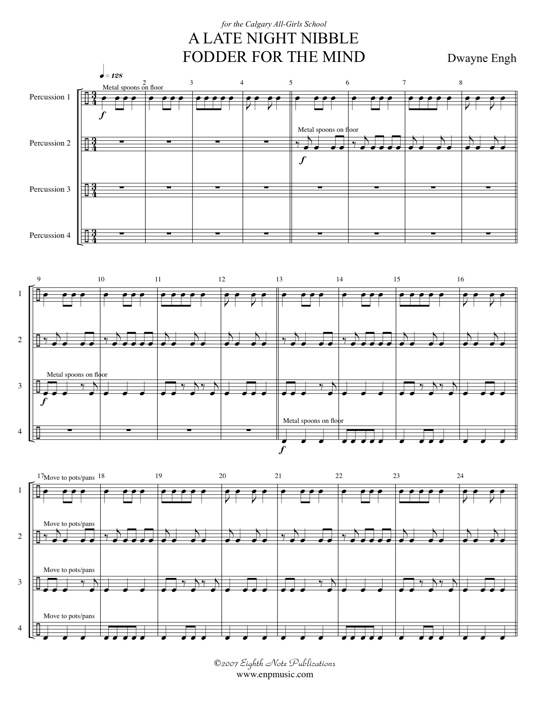 I wrote this piece with the intent of creating a fun piece for students to play that a non-musician could easily teach to a sixth grade class with no musical experience. It is scored for 4 players playing spoons and pots and pans.