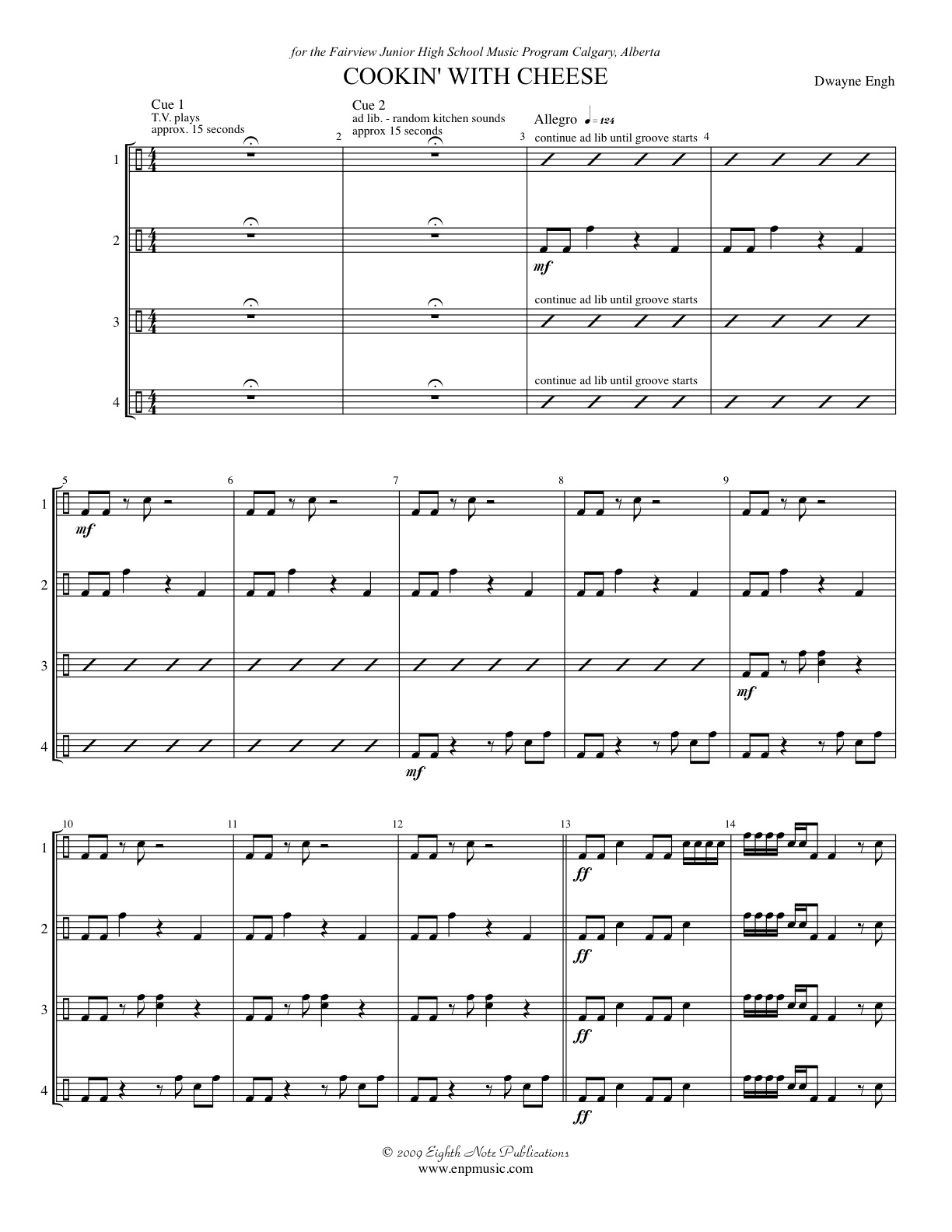 Cookin With Cheese pokes fun at poorly produced TV cooking shows. It starts with a video of a cooking show (as lame as possible, please), is later interrupted by putting a mini-bag of popcorn in a microwave and starting it; the piece then continues until the musicians break into reciting recipes, and finishes with the reoccurring percussion break (and eating the finished popcorn on stage). |