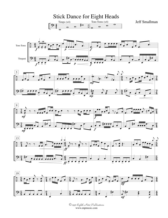 Stick Dance is reminiscent of Canaries, a solo work for 4 timpani composed by Eliott Carter. Like Canaries, this piece is an example of metric modulation, changing tempo using the rhythms present. Unlike Canaries, this work is written for 2 sets of drums: 4 timpani, and 4 tom-toms. The composer chose to use tom-toms due to their percussive tone which offsets the resonance of the timpani. Full of energy and rhythmic drive, Stick Dance for Eight Heads is a great piece for showing off 2 good percussionists. |