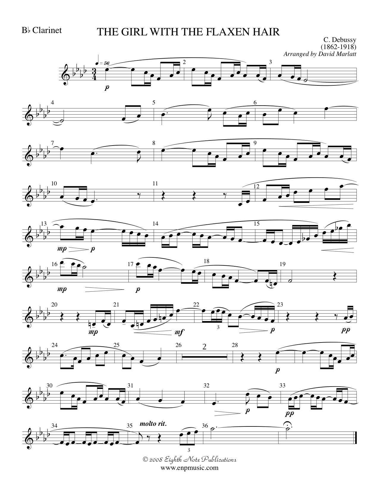 Girl With The Flaxen Hair and Golliwog s Cakewalk are two of Claude Debussy s most popular piano works. It has been said that Girl With The Flaxen Hair, with its impressionistic and progressive harmonies, may have been a significant influence for many jazz artists of the century. This is an arrangement for clarinet and keyboard (organ or piano). |