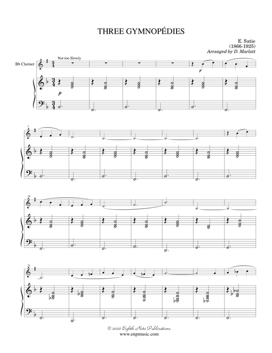 The Three Gymnopdies are the ultimate in quiet minimal pieces. They have been recorded by many instruments from synthesizer to soprano saxophone. Any one of these pieces would be a great change of pace on a concert or recital or would also work well as background music at a wedding, church service or any other ceremony. Durations: 3:20 / 2:45 / 2:30