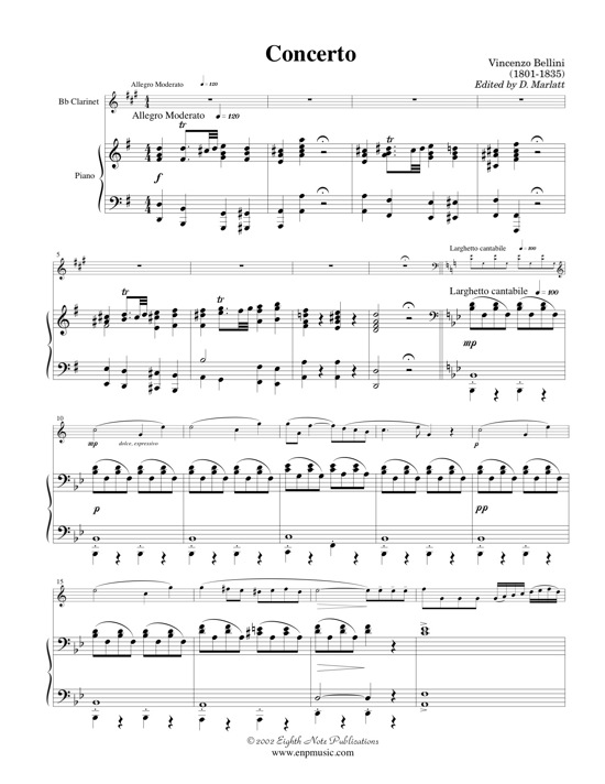 This Concerto by Bellini was originally for solo oboe and strings. This version has been lowered in pitch to facilitate performance on a b-flat clarinet. The technique required for this piece is moderate, the challenge lies in the phrasing and style. |