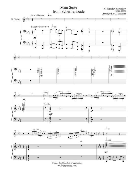 The famous themes from this orchestral masterpiece have been collected and arranged for solo clarinet. Included in this mini suite are the principal melodies from The Sea and Sinbads Ship and The Young Prince and Princess. This is not too difficult and is approchable by students in mid to late high school. |