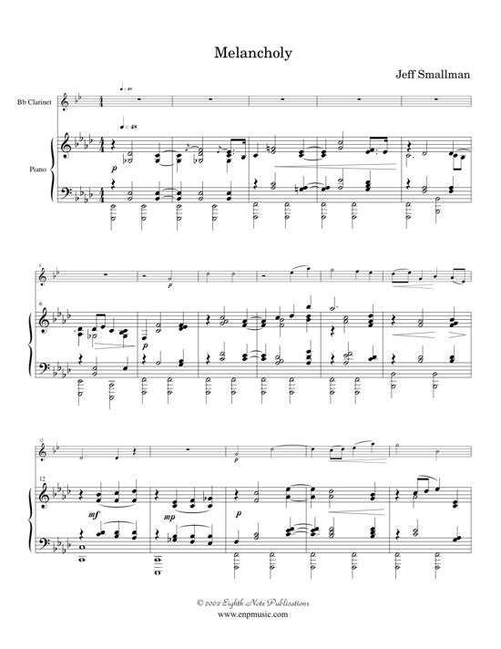 This work is based on the French poem Il Pleure Dans Mon Coeur (It Rains in My Heart). As expected from the title, this work has a dark feeling to it. Slow and brooding, the piano sets the feel with the soloist lending to the overall effect by playing a slow, haunting melody. The middle section brightens, giving the listener a feeling of wistful hope, but this is short-lived as the section ends with the soloist playing a meandering line, searching for an answer. |