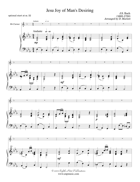 This very popular piece has been arranged many times for various instruments. This version for clarinet and keyboard (either organ or piano) alternates between the chorale theme and the wandering counter-melody that has made this piece so famous.