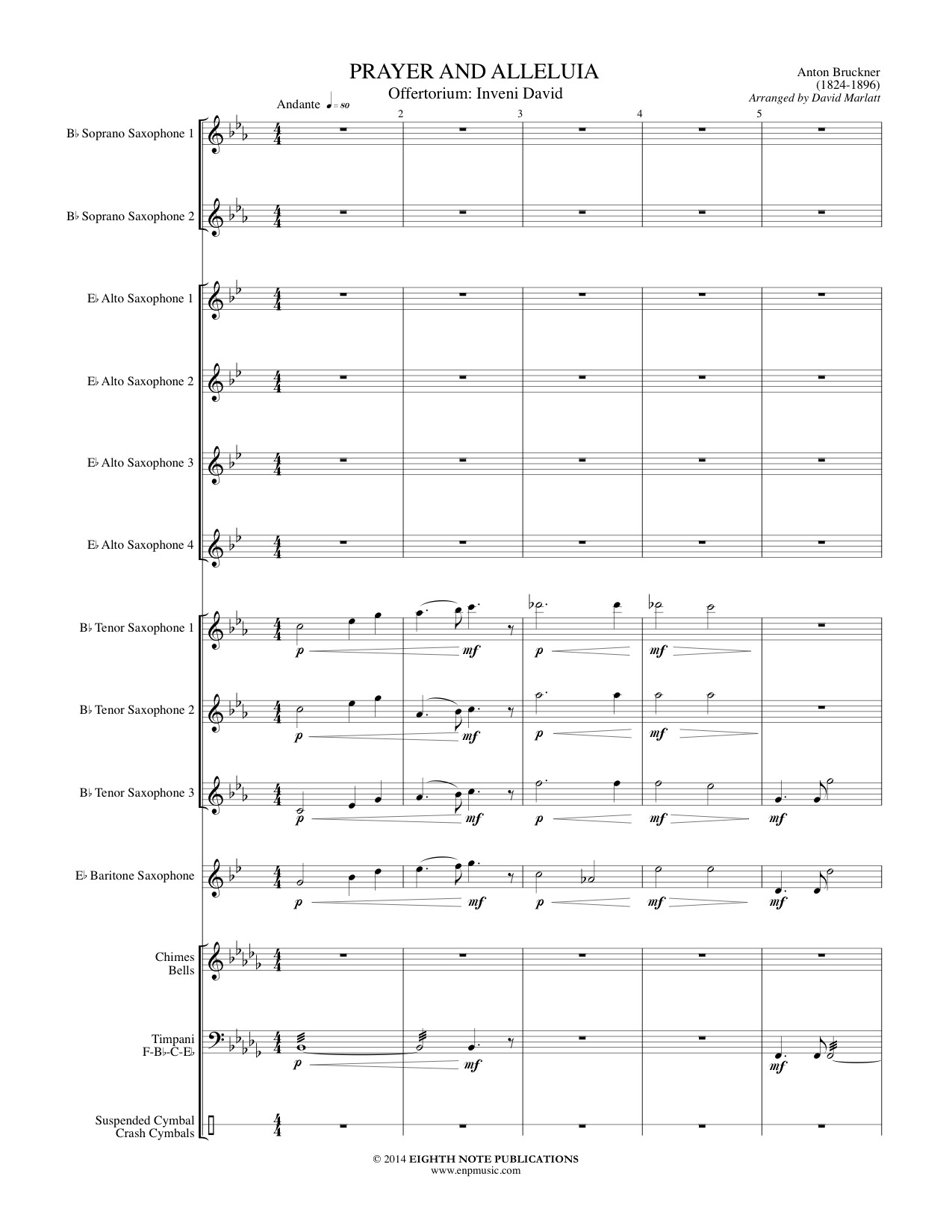 Inveni David is an offertory that was originally set for male chorus and four trombones. This powerful work opens in B-flat minor and gradually builds to a brilliant B-flat major Alleluia. It has been arranged here for 2 Sopranos, 4 Altos, 3 Tenors, Baritone and optional percussion. |