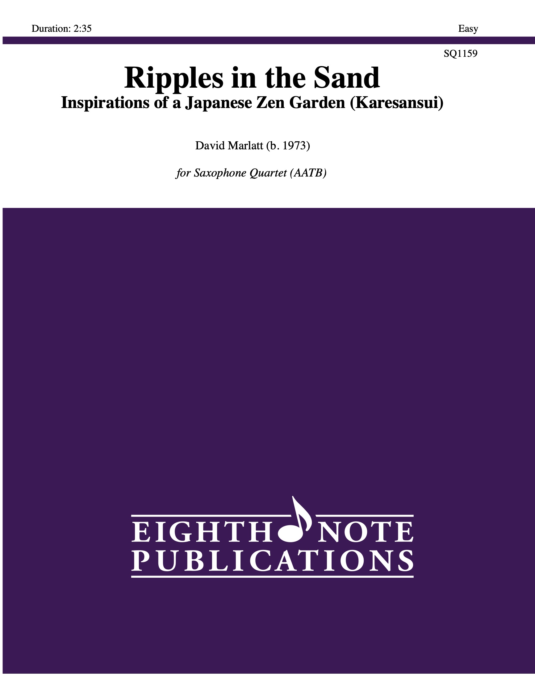 A karesansui is a Japanese rock garden which is an enclosed shallow sandbox containing sand, gravel and rocks. The sea is symbolized, not by water but, by sand raked in patterns that suggest rippling water. This short work is peaceful and reflective and accessible to young musicians. The major pentatonic scale is used as the basis for this composition which creates an interesting texture and evokes the sound of an ancient Japanese folk song.