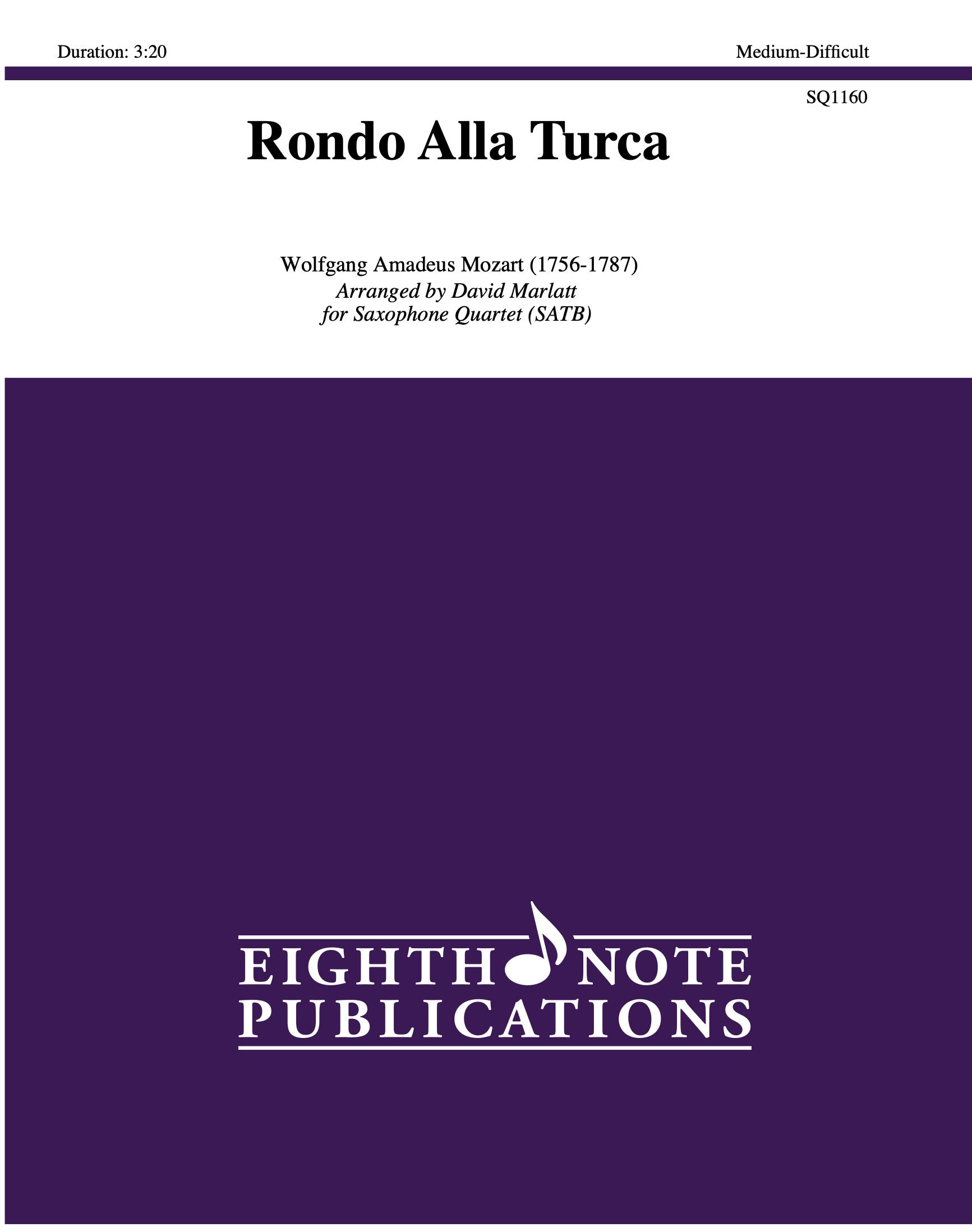 Rondo alla Turca is the well-known final movement from Mozart s Piano Sonata in A Major K. 331. This has been arranged as a technical showpiece for sax quartet. The melody flows throughout the ensemble and all members get a chance at some flashy, technical sections. |