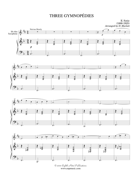 The Three Gymnopedies are the ultimate in quiet minimal pieces. They have been recorded by many instruments from synthesizer to soprano saxophone. Any one of these pieces would be a great change of pace on a concert or recital or would also work well as background music at a wedding or church service. Durations: 3:20 / 2:45 / 2:30 |