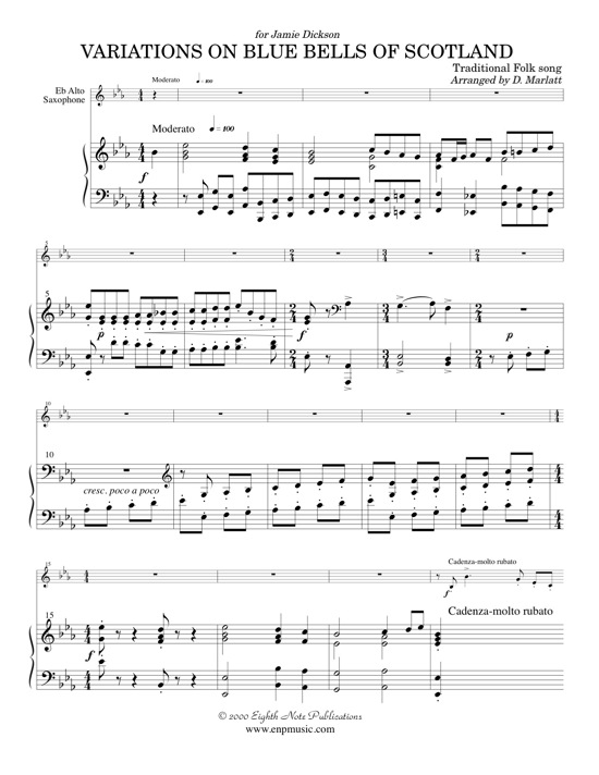 In the past this folksong has been arranged in a theme and variations format for flute, trumpet and the most famous version for trombone. The technical requirements of this piece do not exceed most players. A student in the first few years of playing could start working on the simple theme, then gradually add variations as their technical abilities increased. The piano part contains a simple accompaniment as well as break strains to give the player rest. |