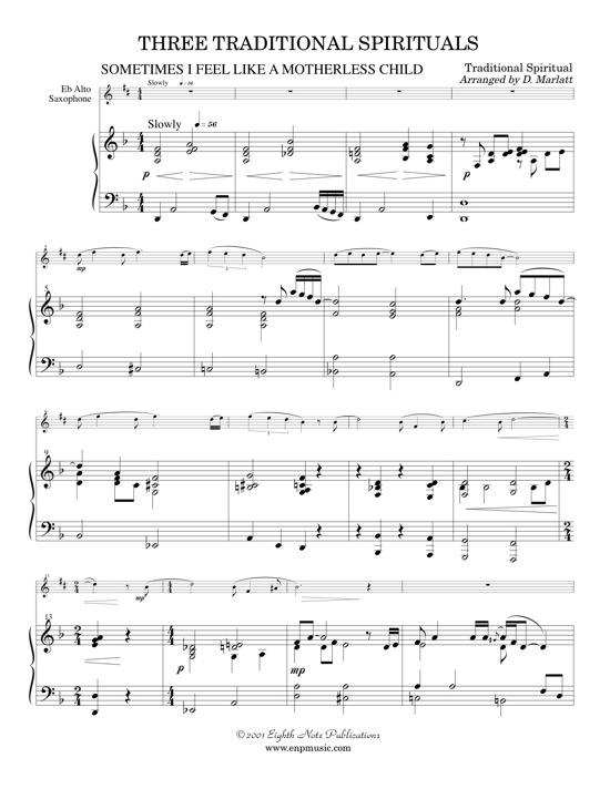 Spirituals have found their way into the standard repertoire of vocalists and instrumentalists. The lyrical tunes combined with the powerful message they tell affect us all. Presented here are three separate spirituals which are all reflective in nature: Sometimes I Feel Like a Motherless Child, My Lord, What a Morning and Steal Away. All the pieces are supported by an interesting piano part with jazz harmonies and a rhythmic pulse. These pieces are ideal at church, on a concert or for use at a competition. Durations: 3:30 / 4:20 / 2:00