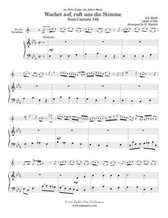 This version of Wachet Auf allows a solo alto saxophone and keyboard (piano or organ) to perform this work at weddings, church services or any other distinguished event. The solo part alternates the sustained line with the more technical line which provides interest in sound and interest in playing. |