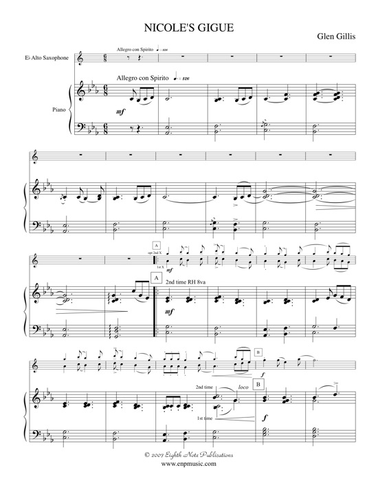 Nicoles Gigue was written for the daughter of the composer. The piece, for alto saxophone with piano, is modal, based on an aeolian scale. The Gigue is in a typical 6/8 meter with a scottish snap. The slow middle section in 4/4, is based on a quote from Nicoles Aria as well as the second theme of the first section of this piece. With the return of the dance, the piano accompaniment is embellished to provide more energy leading up to the coda. |
