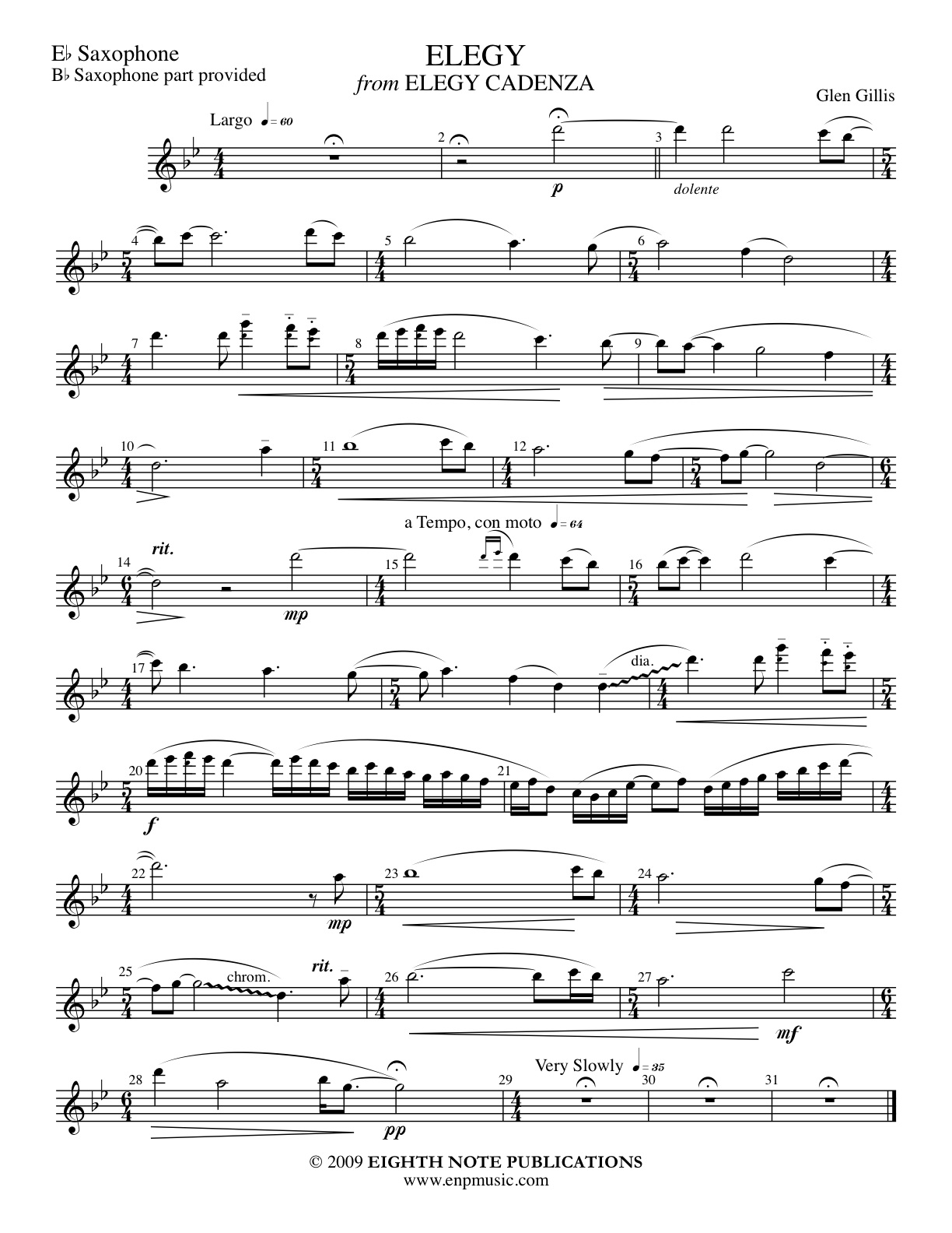 Elegy for Bb (soprano or tenor) or Eb (alto or baritone) saxophone and piano is taken from the slow middle section of Elegy Cadenza (2009) by Glen Gillis. Based in the Phrygian mode, it is a simple but mournful melody portraying the emotions of loss and the cherishing of memories. |