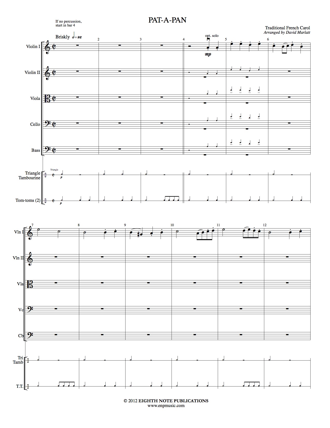 Pat-a-Pan is a very rustic Christmas piece that is set in a round beginning with a solo violin and pyramiding down to make a quartet. The percussive drone parts add a distinct color to this piece and this sort of writing works well with strings. The cello gets to shine with an unaccompanied pass through the melody. |
