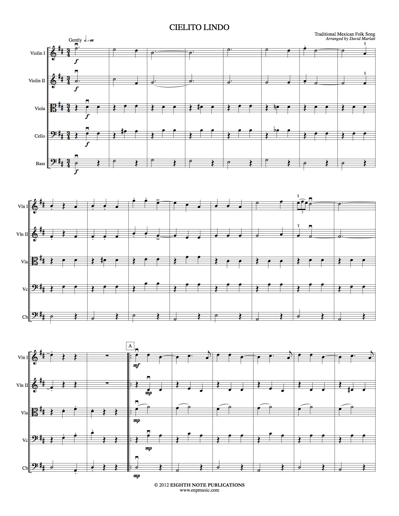 Cielito Lindo is a popular traditional song of Mexico and is often used by tenors on opera aria concerts or as an encore. In this arrangement, the violins and cellos each get a chance at the melody. This is a great audience pleaser.