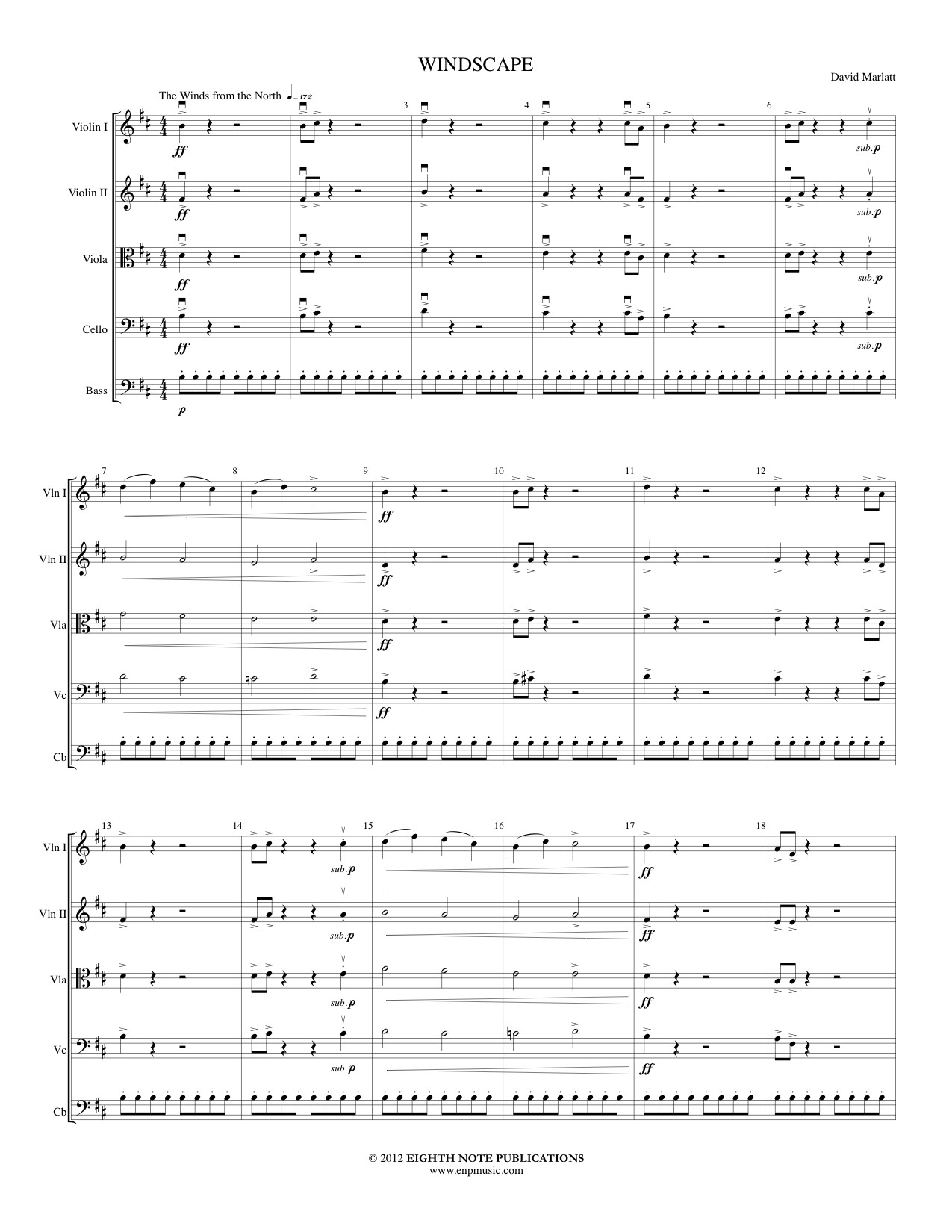 Windscape is in four sections. It opens with The Winds from the North. The driving bass line combined with the punctuated shots represent the bitter winds that blow into Ontario in the winter time. This moves into The Winds of Change. This has a shifty but steady pulse that features melody in the violins at first and then a counter melody is added the viola. Crystal glasses and a lone viola are the featured sonorities in The Winds of Mystery. The Winds of Change then reappears and, with several sidebar introductions of new rhythmic and melodic material, the piece ends as it should - driving and enthusiastic. |