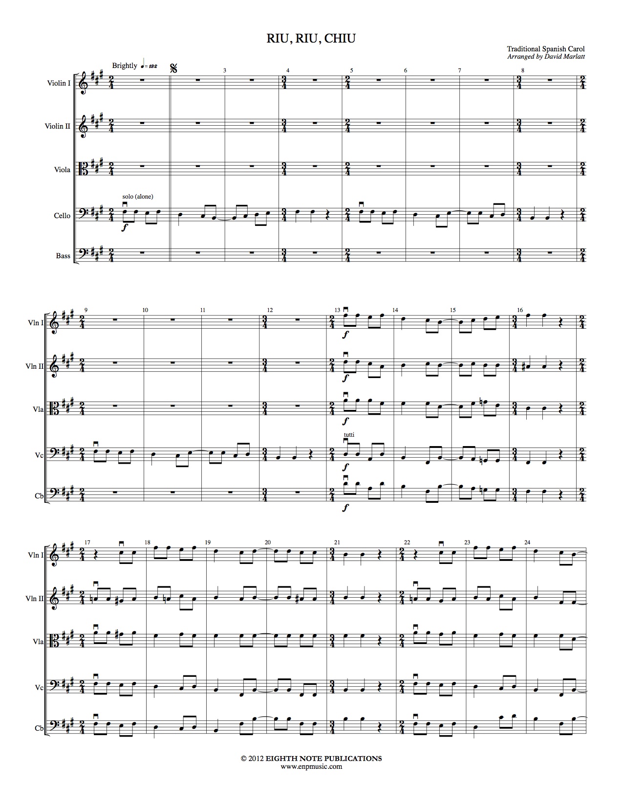 This is a lesser known Christmas piece dating from around 1550. It is rhythmic and colorful with melody in several voices. The opening is a call and response between the solo cello and the remainder of the group. There are some sections with some fast bow work, but the piece is not too difficult for a group to put together and be enjoyed by audiences. |