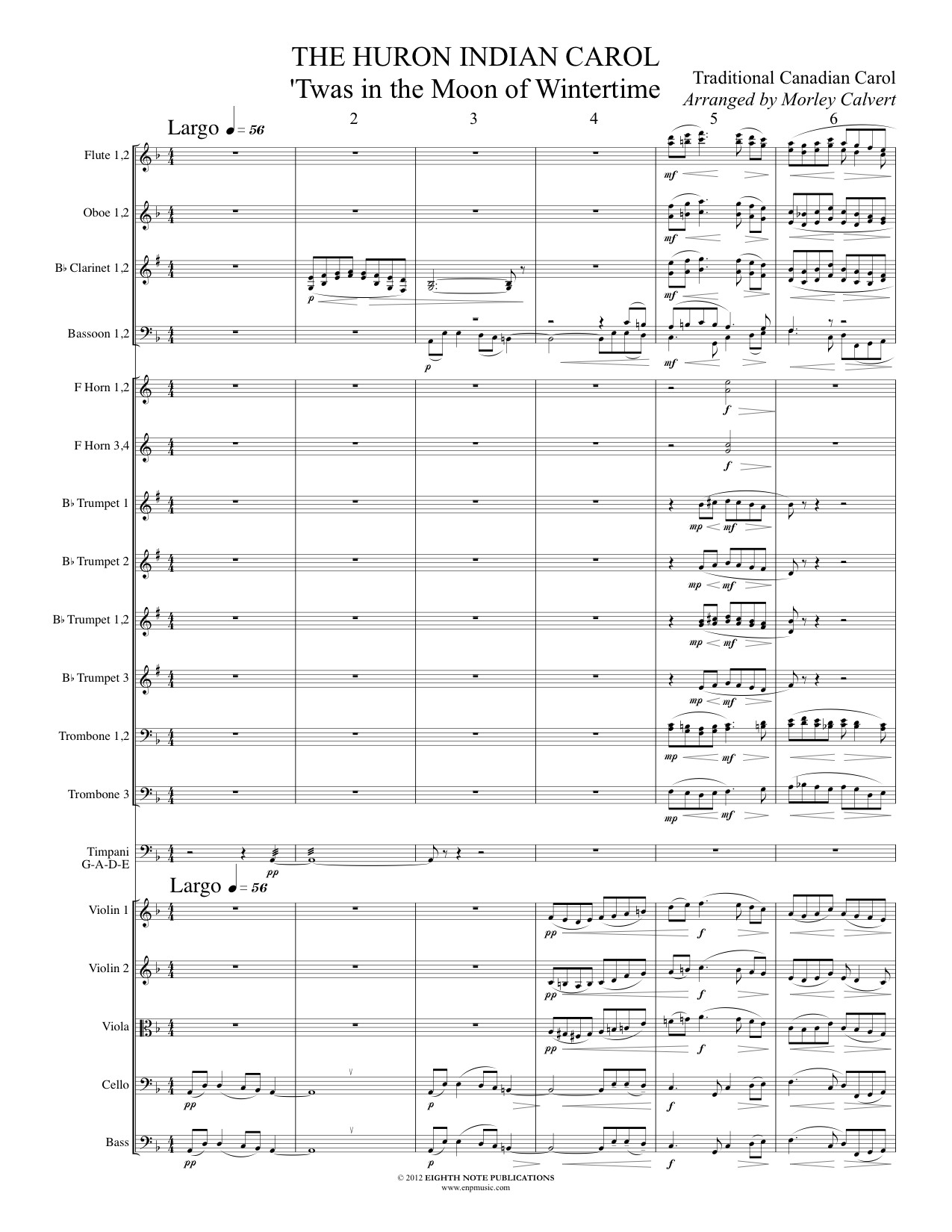 The Huron Indian Carol (also known as The Huron Carol and Twas in the Moon of Wintertime) is generally considered the first Canadian Christmas carol. It was originally written in the Huron Indian language in 1641 and set to an old French tune by a Jesuit priest. This hauntingly beautiful piece, set for full orchestra, is not too difficult but very effective on a holiday concert. |