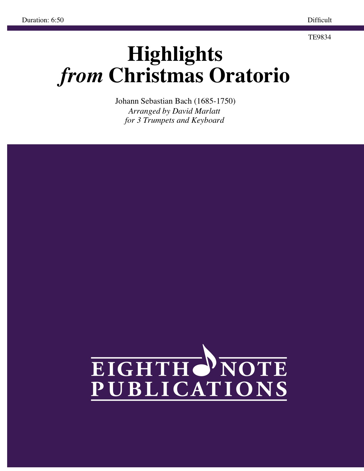Several of the favourite and standard trumpet excerpts come from J.S. Bach's Christmas Oratorio. In this arrangement for 3 trumpets, organ (with optional timpani), there have been four important sections collected in this mini suite. Three of the big chorales and the famous Aria have been extracted from this large-scale work and adapted for trumpets and organ. The original trumpet lines are left fairly intact. There are two organ scores provided - in the original key of D, for performance on piccolo trumpets, and in B-flat, for performance on b-flat trumpets. |