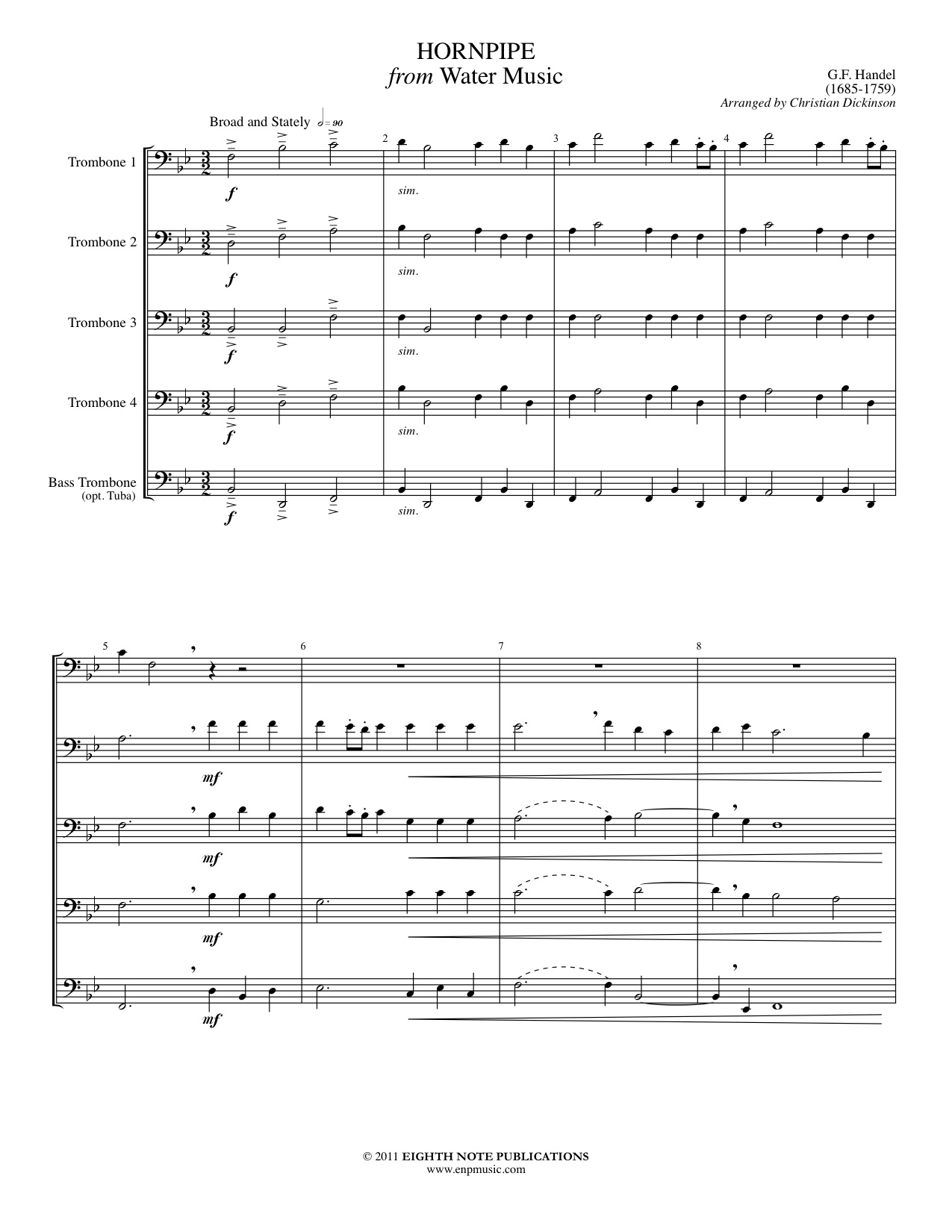 This arrangement of the main theme of Handel s Hornpipe from his Water Music is intended for use by intermediate trombone students. The parts can be played with one or multiple players on a part.