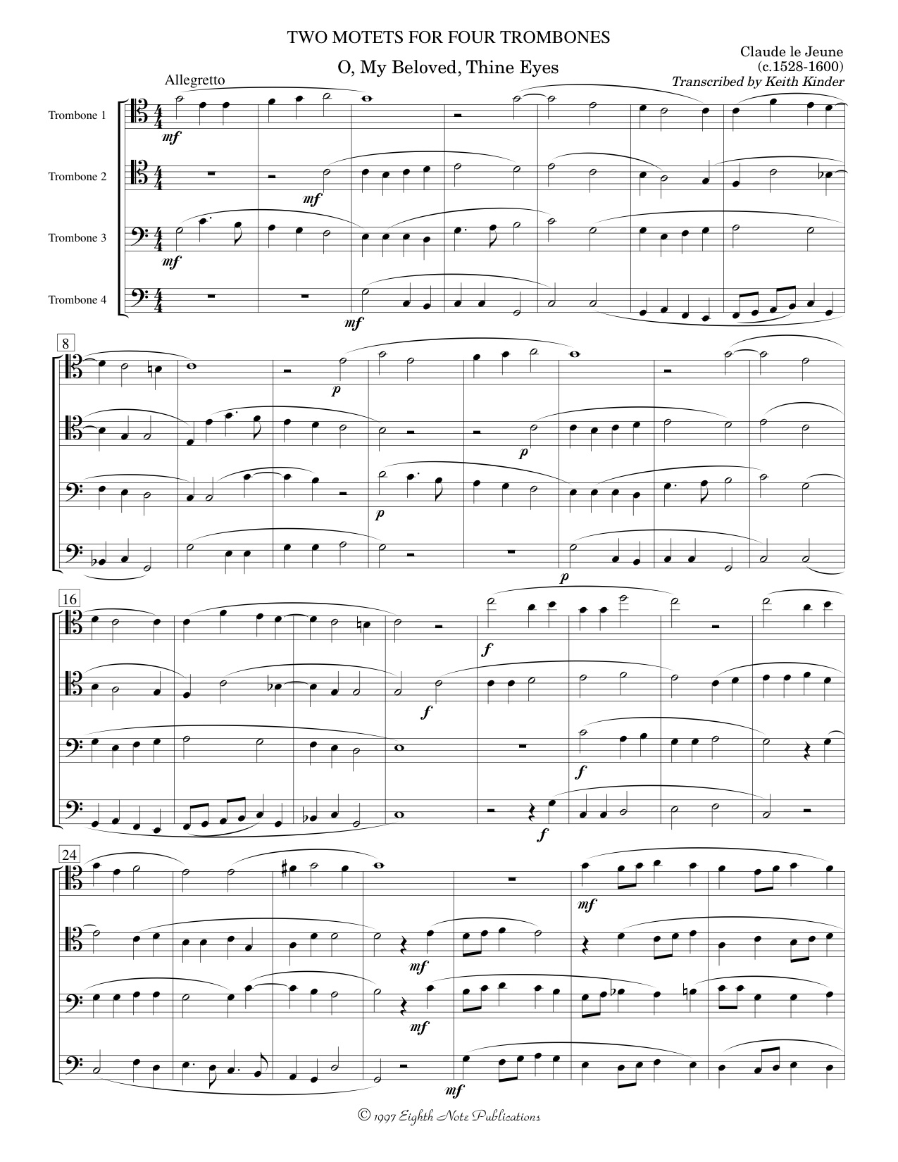Keith Kinder has adapted two Renaissance motets O, My Beloved, Thine Eyes and Sancta Trinitas for trombone quartet. The top part is in tenor clef as the line ascends to high Cs and Ds. The other parts are interesting and the sonority of these quartets is beautiful, particularly in a church setting. |