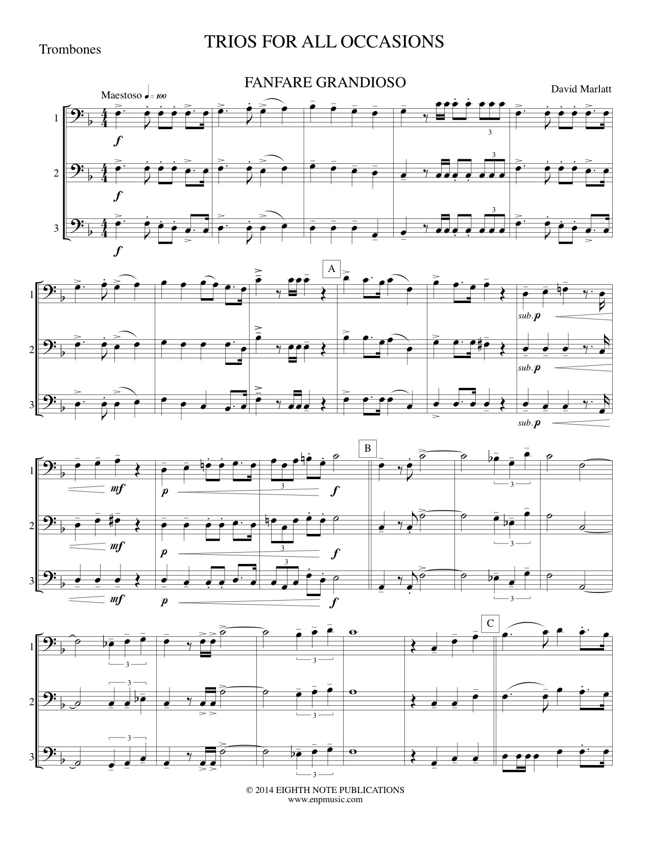 This is a collection of compositions and arrangements of well-loved music set for 3 like-instruments. The arrangements are suitable for a variety of performance situations such as school concerts, at church or on gigs in the community. Pieces included are: Fanfare Grandioso, Trumpet Voluntary, Ode to Joy, March Triumphant, Little Brown Jug, Allegro Maestoso from Water Music, Washington Post, Abide With Me, Still, Still, Still, Christ the Lord is Risen Today, Canon (Mozart), The Dwarfs March Home, The Entertainer and Brain Waves.