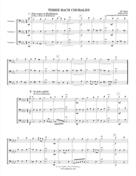 Trombonists have always played chorales for the development of fine ensemble performance. The limited technical demands, clear harmonies and independent lines in this style permit players to focus on balance, blend, tuning and matched sound and articulations. |