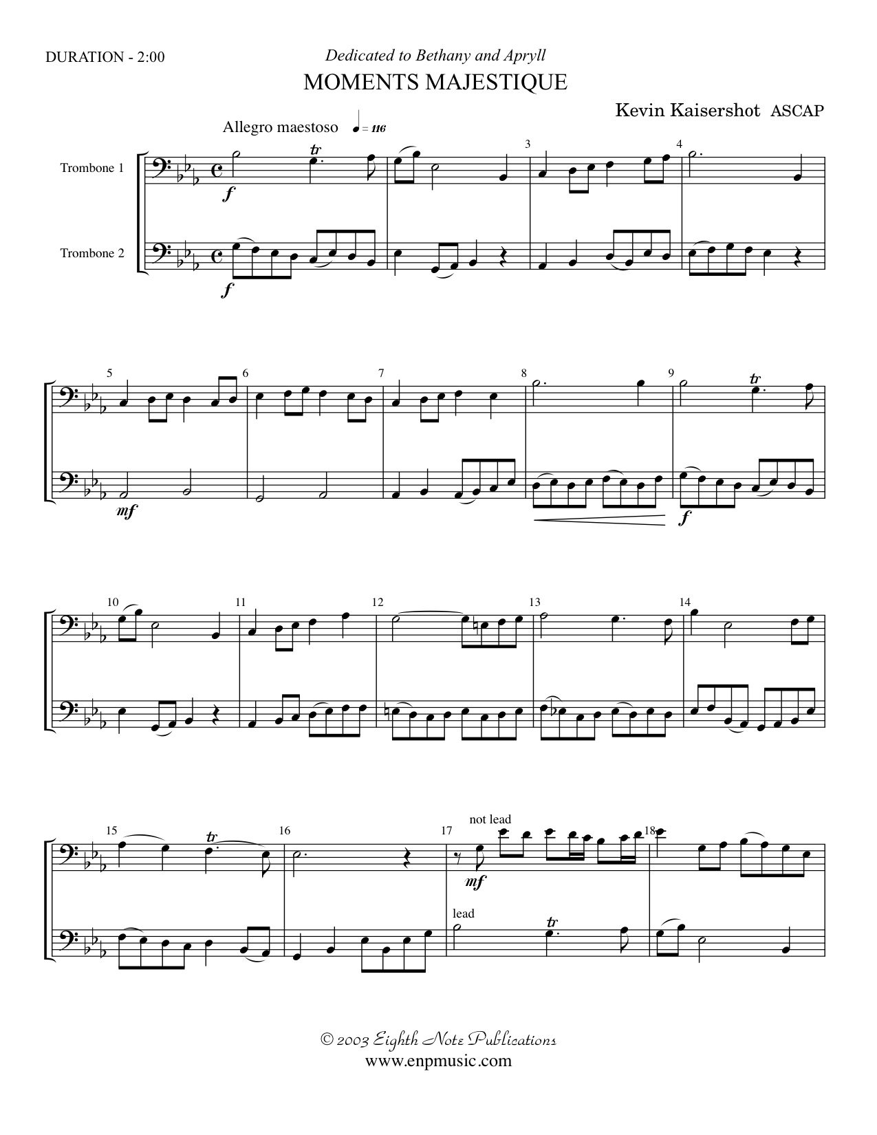 Moments Majestique is a versatile duet that works well for any occasion. It has a royal or regal air about it, and is adaptable to almost any instrumental combination or cross-over. It is designed for the intermediate level performer, but can be played by almost any level performer as ranges are small and rhythms reasonably simple.