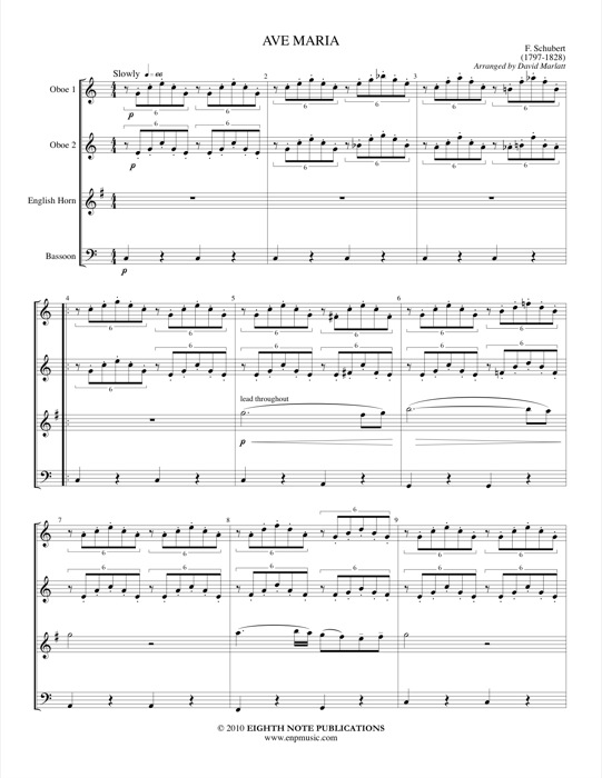 This is among the most popular and often used pieces at weddings and recitals. The simple accompaniment combined with the famous flowing melody makes Ave Maria a great choice to feature the English horn player throughout. This has been arranged for a double reed ensemble consisting of 2 oboes, english horn and bassoon. |