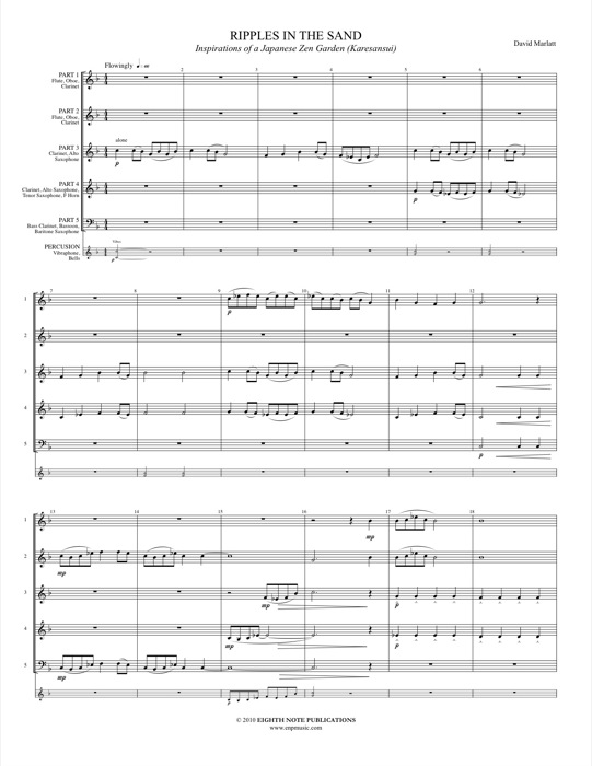 A karesansui is a Japanese rock garden which is an enclosed shallow sandbox containing sand, gravel and rocks. The main elements are rocks and sand, with the sea symbolized not by water but by sand raked in patterns that suggest rippling water. This short work, for an interchangeable woodwind ensemble and optional percussion, is peaceful, reflective and accessible to audiences. The major pentatonic scale is used as the basis for this composition which creates an interesting texture and evokes the sound of an ancient Japanese folk song.