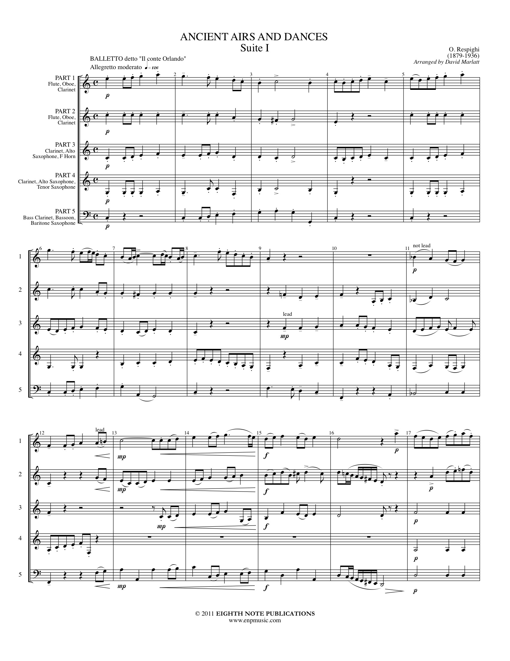 This famous orchestral piece is now available for an interchangeable woodwind ensemble. Respighi took 17th century lute pieces and arranged them to exploit the colors available to the modern orchestra. This is the first movement of the first suite. The melody flows throughout the ensemble with most parts getting sections to lead. A great piece of chamber music on a concert or recital.