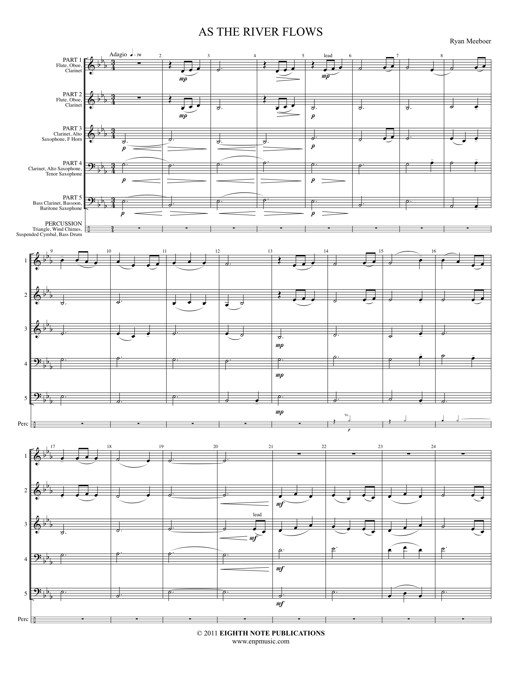 This lyrical piece is composed using ternary (ABA) form and gives every section an opportunity to shine. Filled with rich use of harmony and a flowing melody, As the River Flows is a great way to teach an ensemble expressive style.