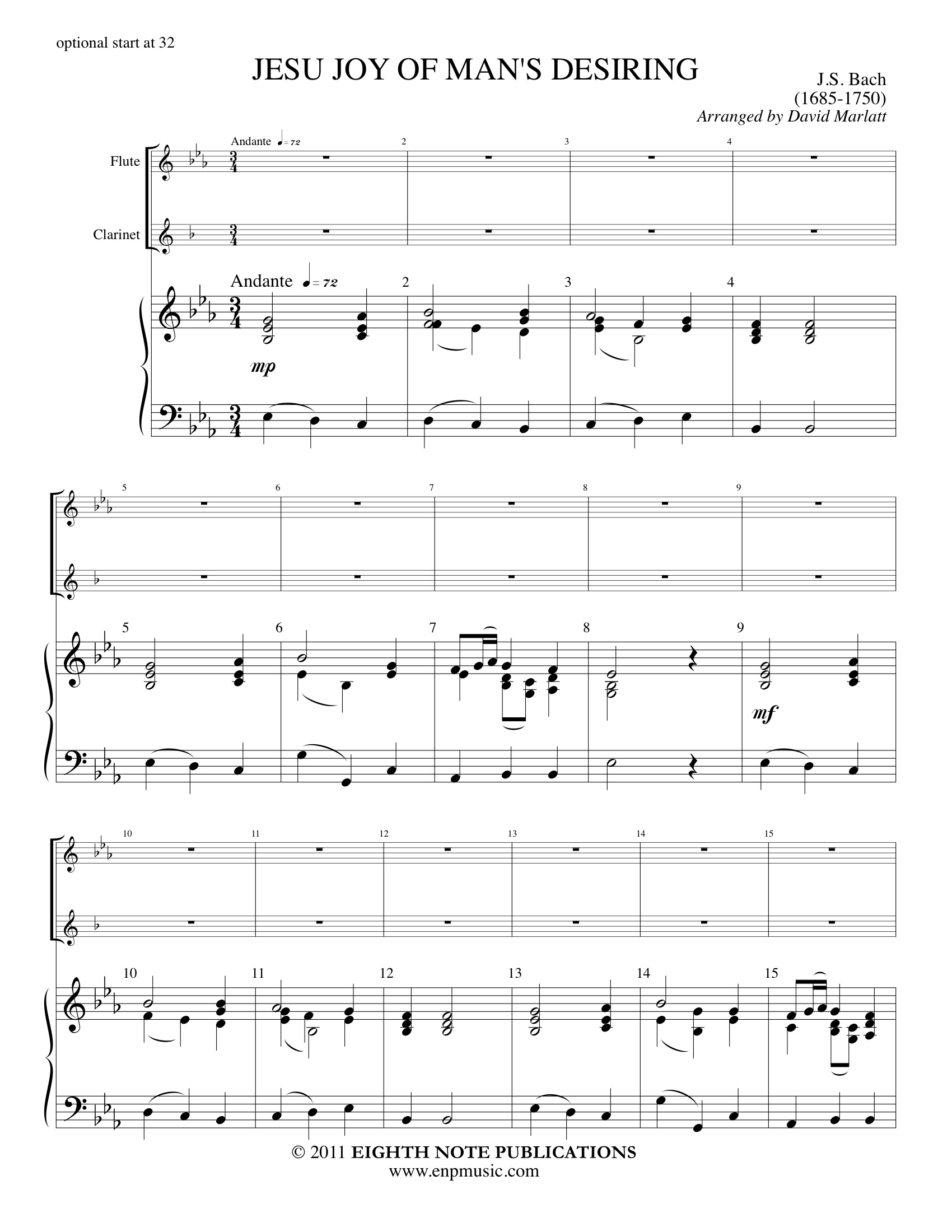 This very popular piece has been arranged many times for various instruments. It has been adapted here for flute, clarinet and keyboard. The chorale is played before the popular triple metre theme. The voices pass the weaving line between them and the chorale is stated above it. |