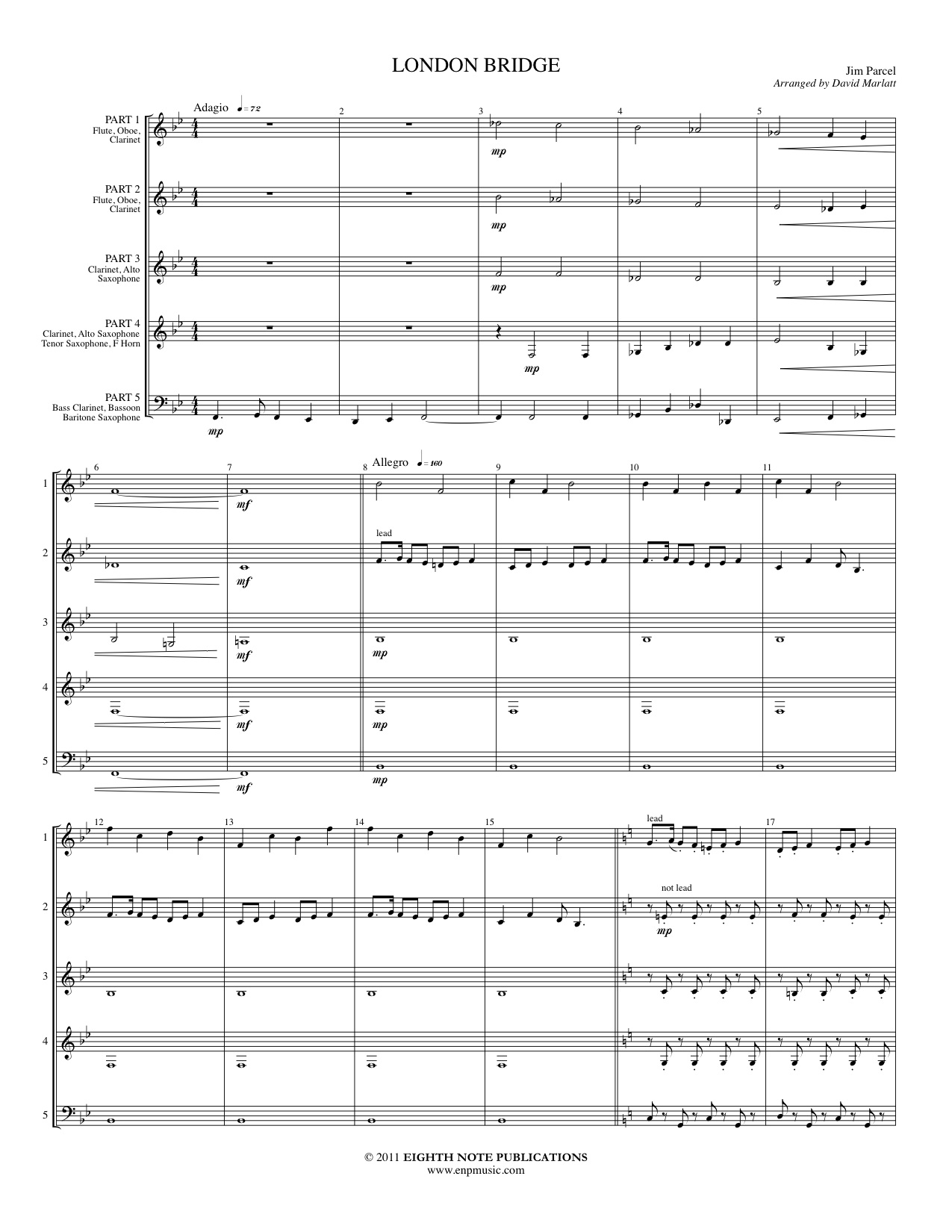 London Bridge was originally written for brass quintet and later scored for concert band. This is the composer recalling the quintet version s premiere. London Bridge was designed to appeal to children, but also to the child remaining in the rest of us. It kind of developed as it went along and ended up where it is today if that makes any sense at all. A few days after the first draft was finished I took it to a clinic for high school band members at one of the Anchorage schools. The clinic was put on by the Canadian Brass who were in Anchorage on a concert tour. They sight read it at the clinic. I even asked them to autograph the parts. They did. I did not have the nerve to ask them what they thought about it, and they offered me no opinion. That may have been good. This is a terrific novelty piece that shows off the whole group, quotes famous pieces and allows the students to really have fun. |