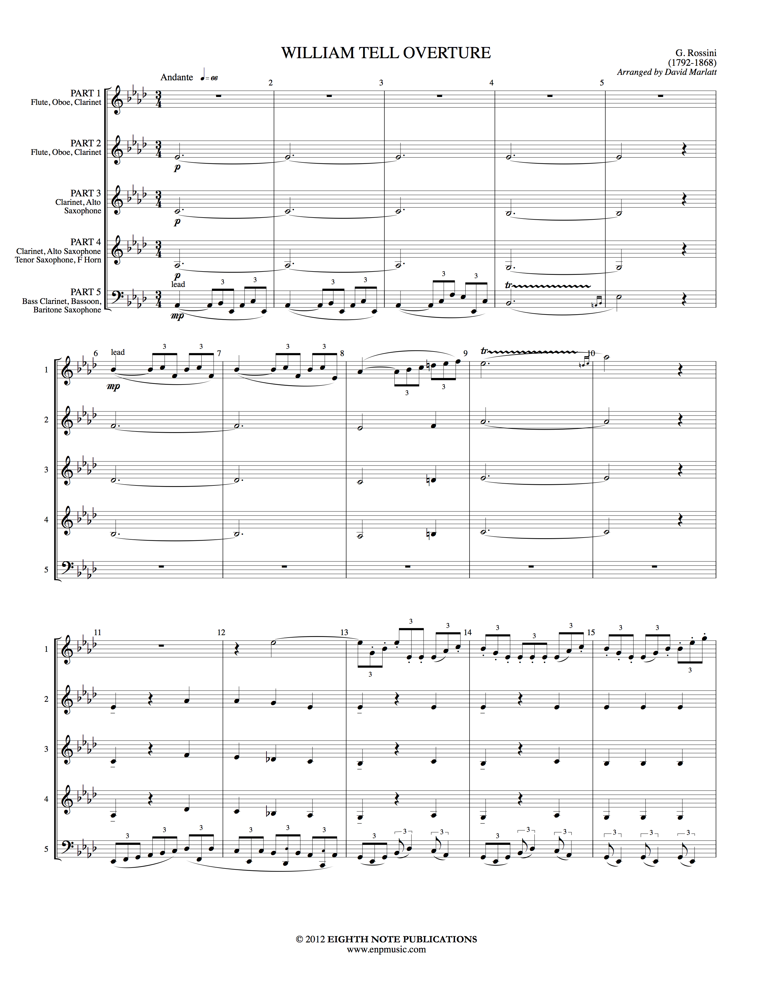 One of the most popular songs of all time is now available for interchangeable woodwind ensemble. It opens with a lyrical solo (originally for english horn) then breaks into the galloping horse theme. Hi-yo Silver, away!
