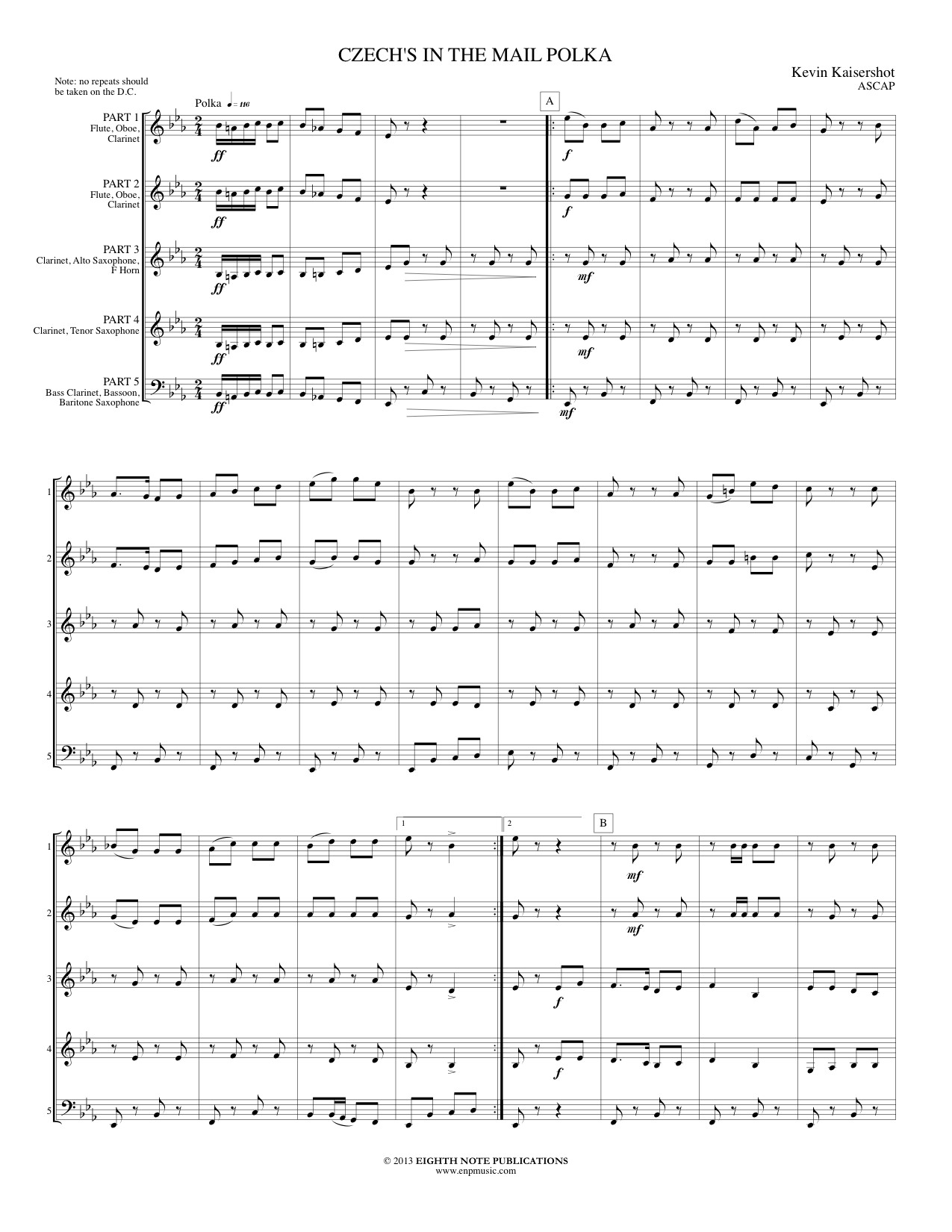 Czech s in the Mail Polka was written as a tribute to the German-Czech style polkas that the composer became so familiar with during his undergraduate years at the University of Nebraska-Lincoln. He was a regular member of a local polka band and played the occasional dance job on numerous weekends.