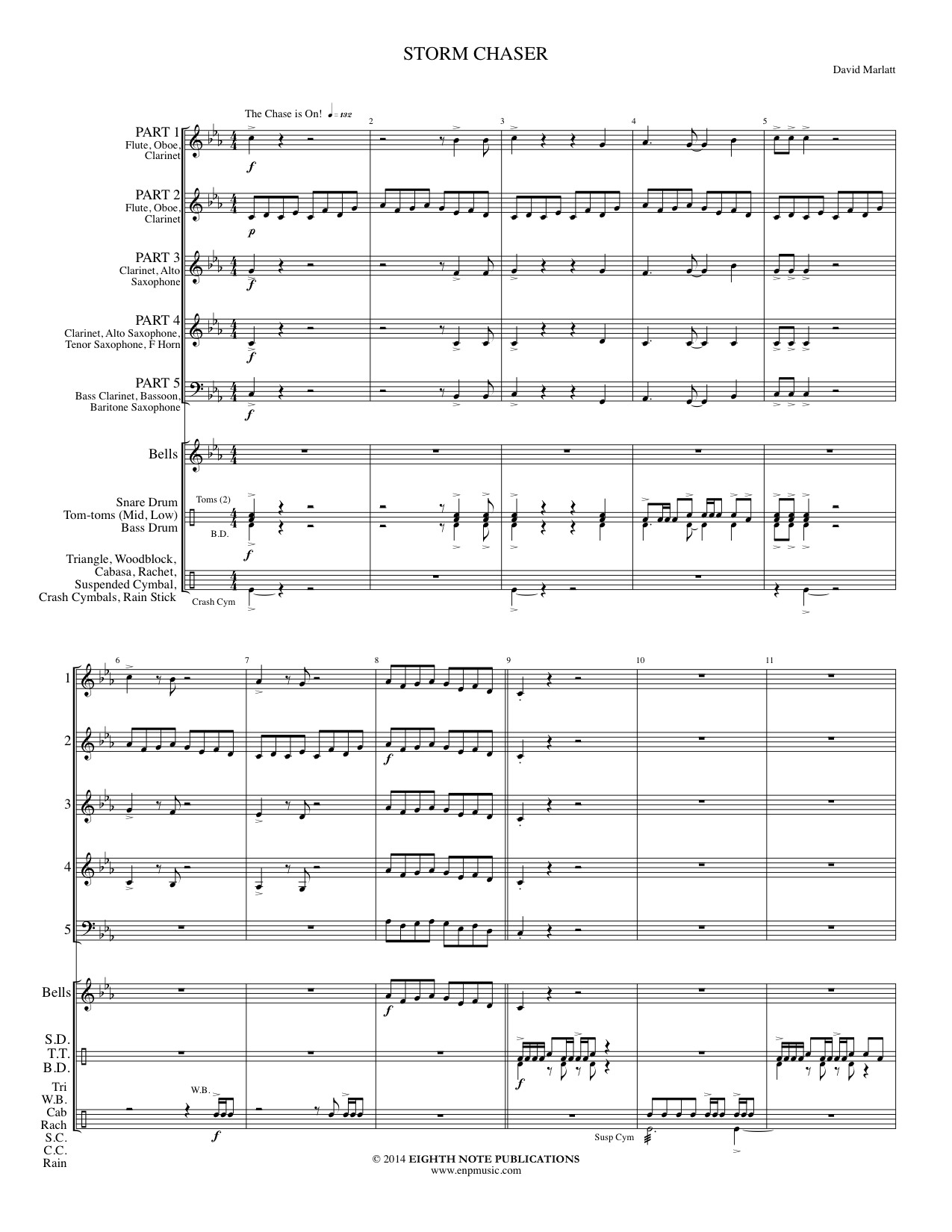 Storm Chaser is an exciting and energetic piece which combines dynamic and driving rhythms and a variety of percussion colors. Storm chasers are brave men and women that persue tornados or hurricanes for scientific work or just for the thrill of witnessing these amazing natural events up close. An audience generated rain effect and a pick a note measure will make this a unique experience for both performers and audiences. |