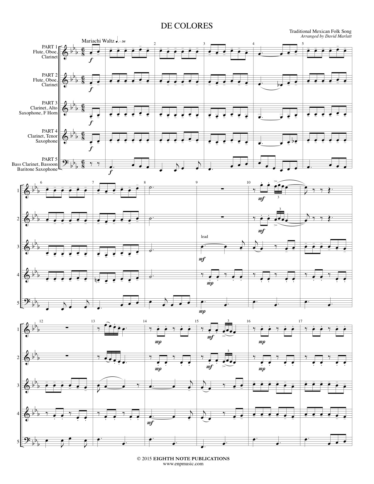 De Colores, or All the Colours, is a traditional Mexican Folk tune often performed by the famous Mariachi bands. This simple and elegant waltz has been arranged as a duet in the middle voices while the top two voices play the trumpet parts which really contribute to creating the Mariachi sound. |