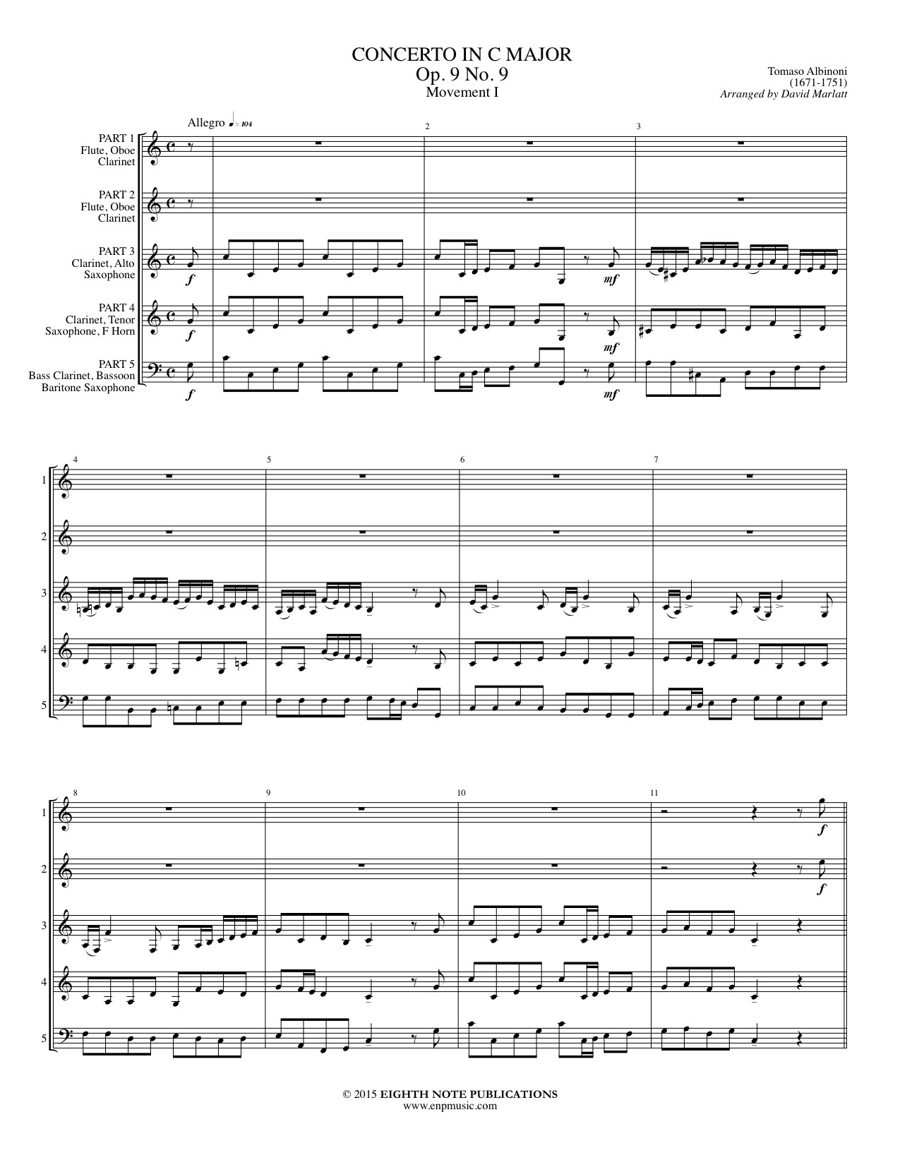 This concerto is the ninth of twelve originally for 2 oboes and strings. With the way it was written this work is more of a chamber piece rather than a duet with accompaniment. Part 1 and 2 are the original solo oboe lines with the remainder of the ensemble covering the string parts. |