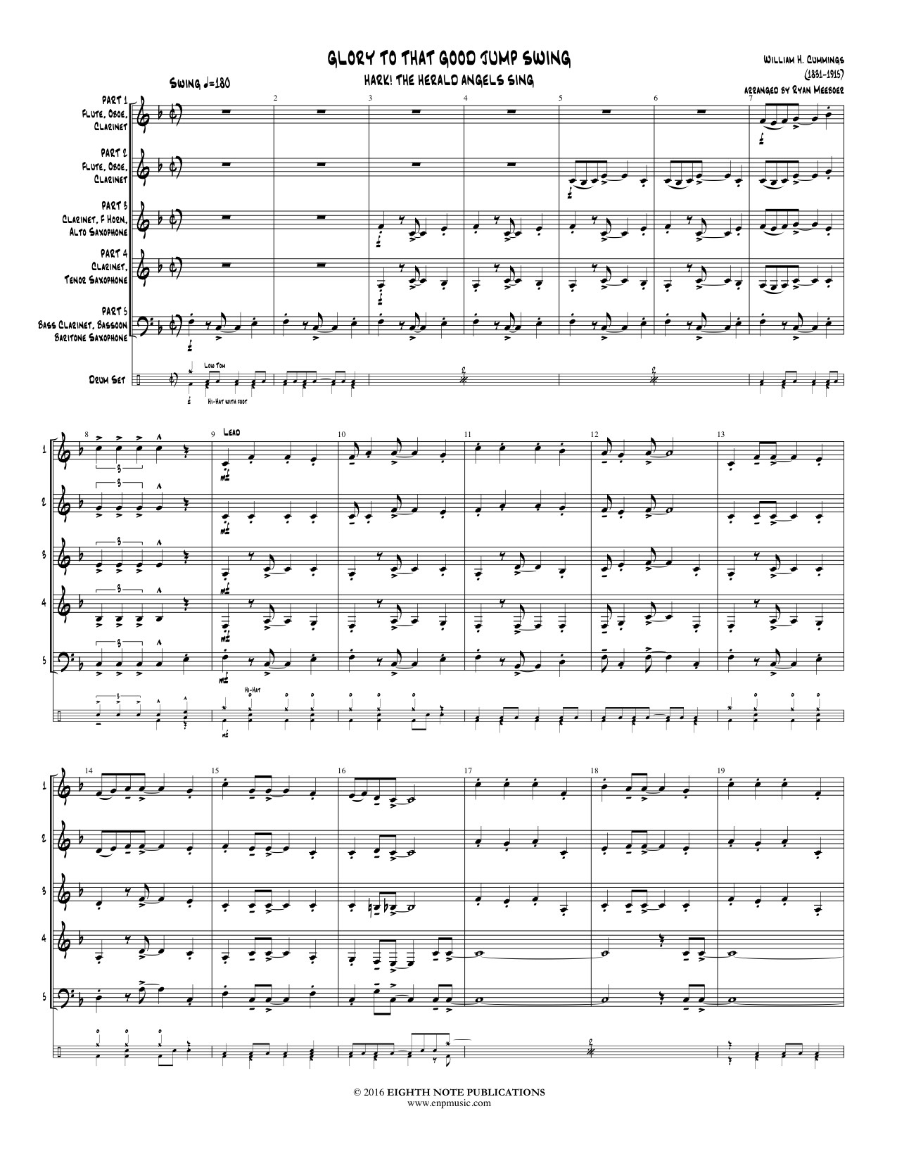 This jump swing version of Hark the Herald Angels Sing will definitely get the toes of listeners tapping. The lowest part introduces the style, by playing a bass line a la Sing, Sing, Sing. Each instrument enters with the same riff that was introduced at the beginning of the piece. Fun! |