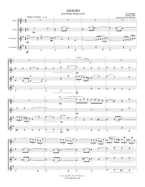 Originally for piano, this Adagio has been elegantly transcribed for 2 flutes and 2 clarinets. All parts are interesting and everyone gets a break. Lyrical pieces, such as this one, have many uses including weddings, concerts and church services. All parts are fairly easy and would require very little rehearsal time to prepare. |